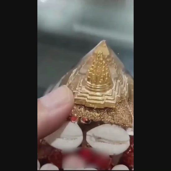 Handcrafted from pure crystal, this pyramid combines the Shree Yantra, known as the cosmic map of wealth and divine feminine energy, with the Gomati Chakra, a rare shell believed to be blessed by Lord Vishnu. Together, they form a potent tool for attracting blessings, dispelling negativity, and aligning your space with higher vibrations.